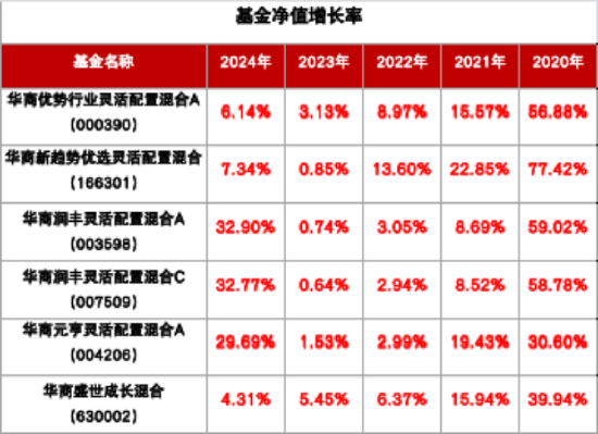 华商优势行业灵活配置混合基金,现任基金经理张明昕,为华商基金权益投资副总监。华商优势行业灵活配置混合A自2020年到2024年5个完整年度实现正收益。截至2025年8月31日,该基金近1年净值增长率为102.44%,近3年、5年、7年净值增长率分别达102.34%、205.07%、464.21%,同期业绩比较基准分别为20.98%、13.17%、7.91、39.40%。其中,该基金近5年业绩排名同类第二。(详见下表)